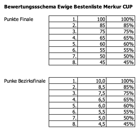 Die in rot aufgeführten Vereine haben sich im 31. Merkur CUP durch ihre Platzierungen in den Bezirksfinals und / oder den Finals im Ranking verbessert.