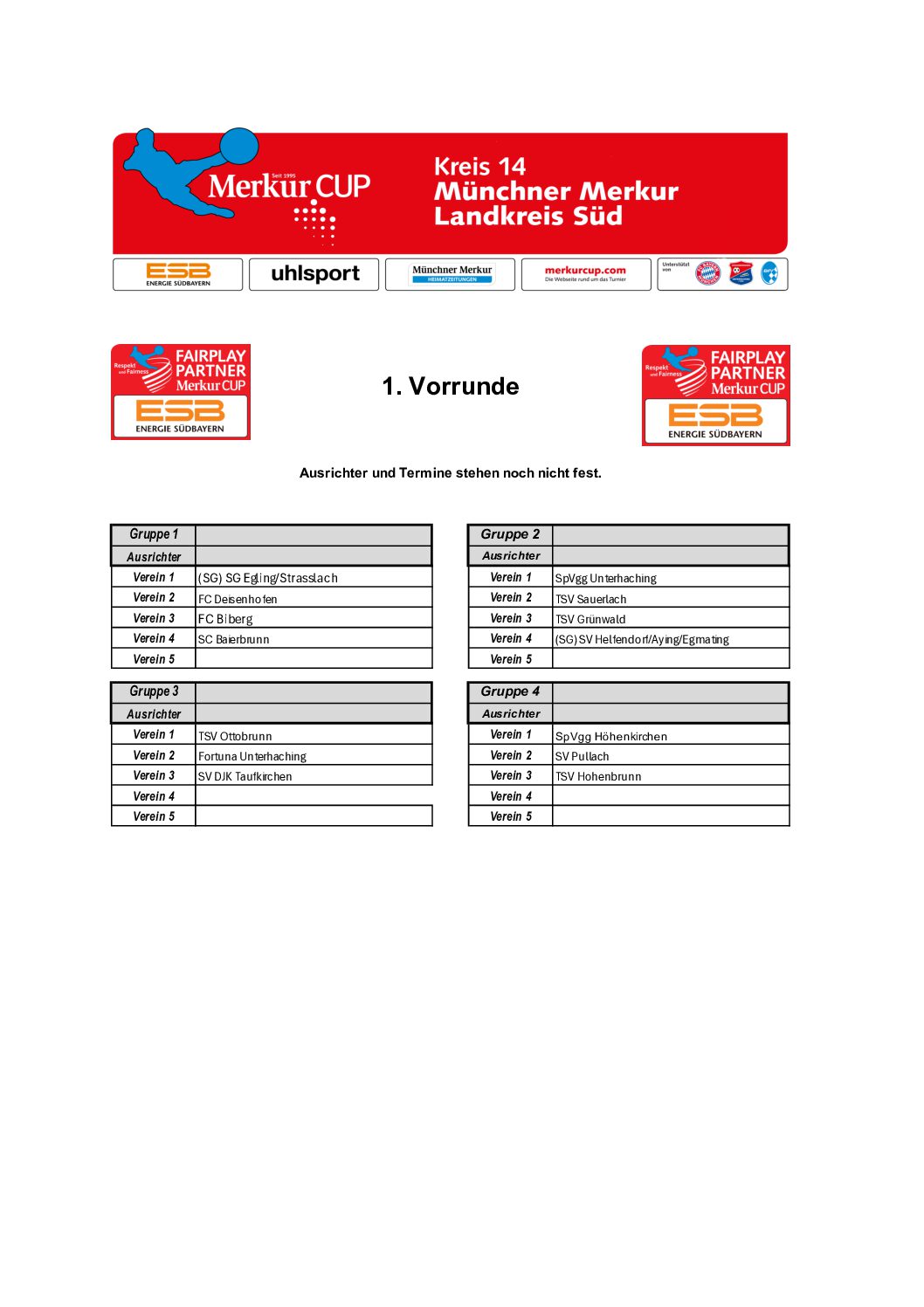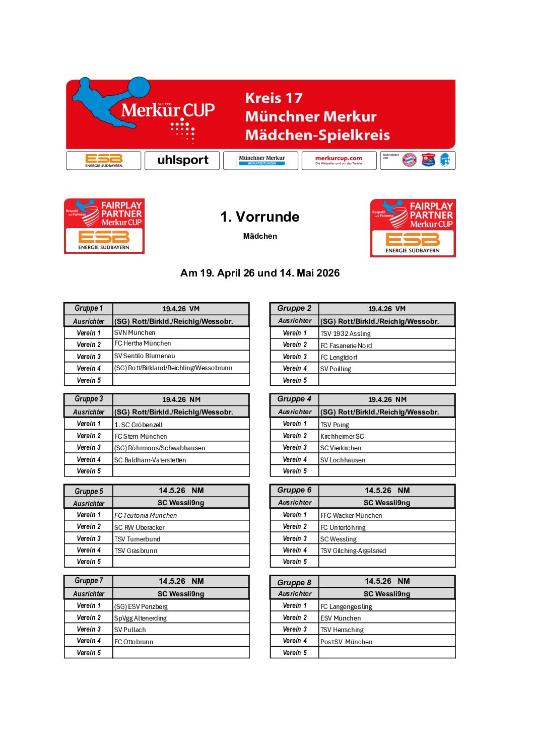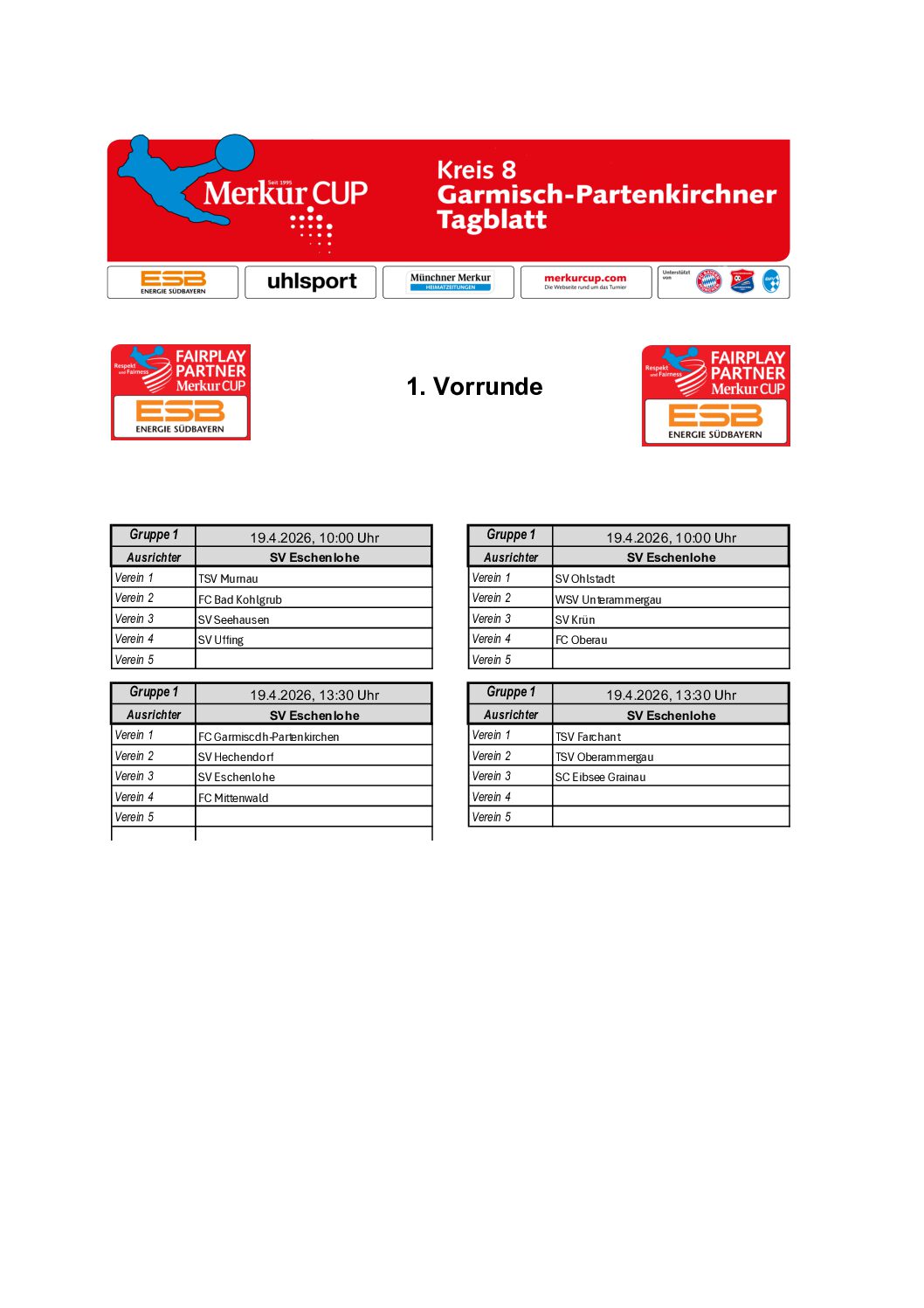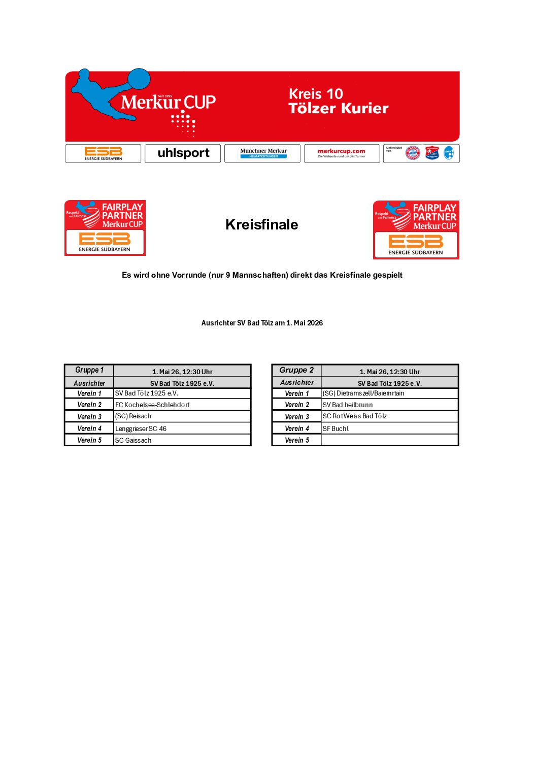 Gruppeneinteilungen 2026 Hier die Ergebnisse der Gruppenauslosung. Die Turnierpläne werden veröffentlicht, sobald sie feststehen. Kreis 01 – FS Kreis 02 – DAH Kreis 03 – ED Kreis 04 – EBE Kreis 05 – FFB Kreis 06 – SOG Kreis 07 – STA Kreis 08 – GAP Kreis 09 – WM Kreis 10 – TÖL Kreis 11 – WOR Kreis 12 – MB Kreis 13 – MM N Kreis 14 – MM S Kreis 15 – MM SW Kreis 16 – MM NO Kreis 17 – MÄ