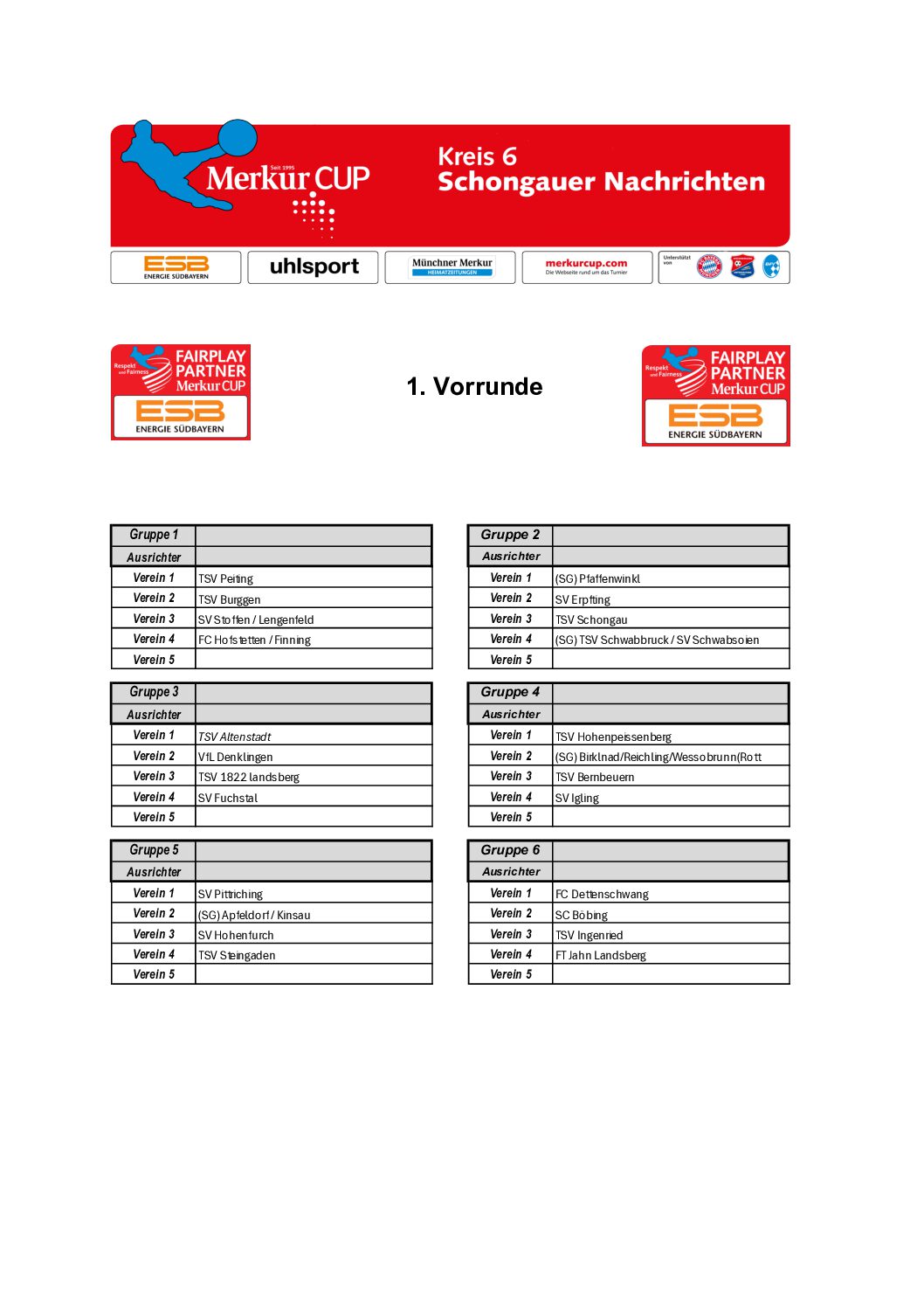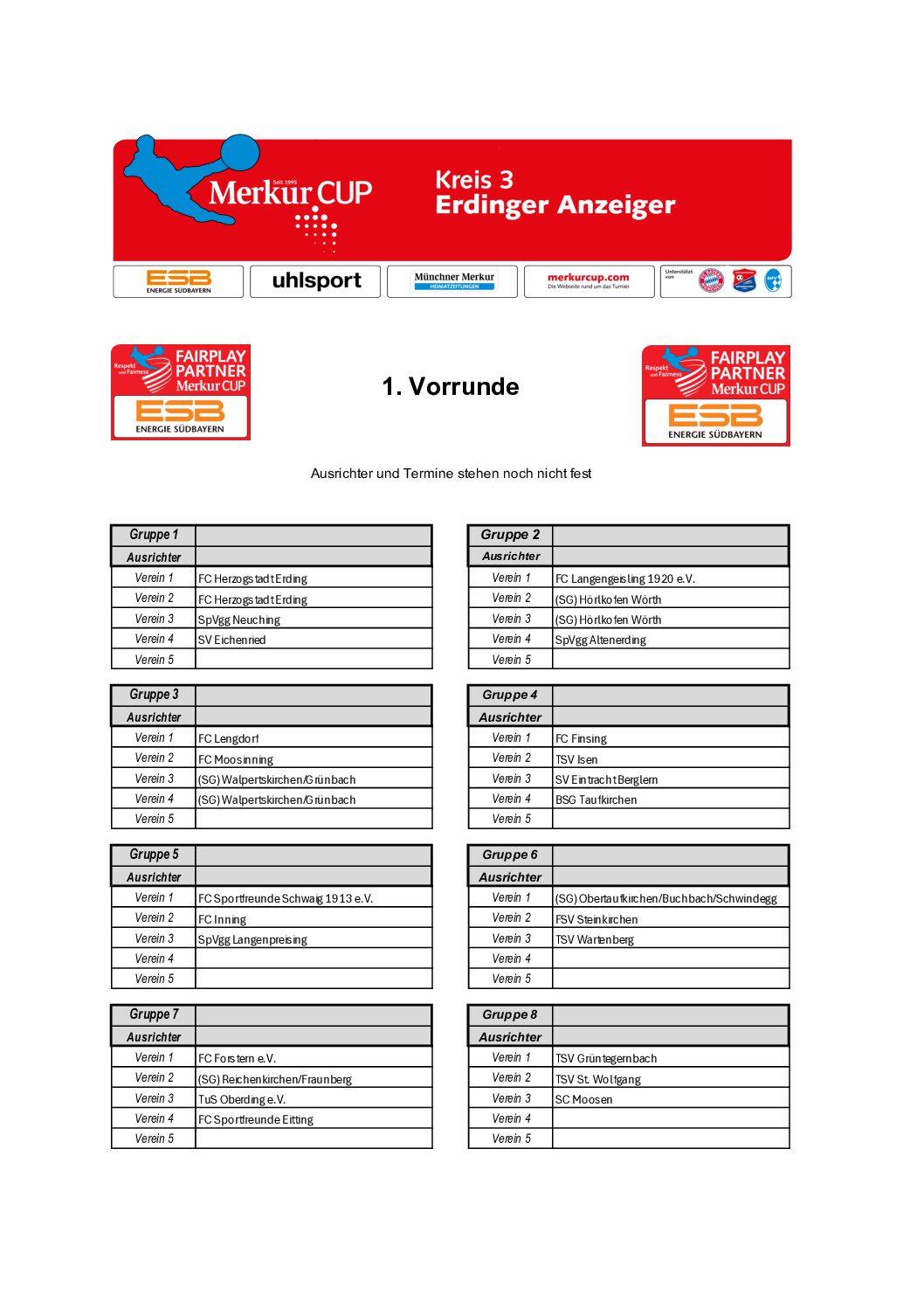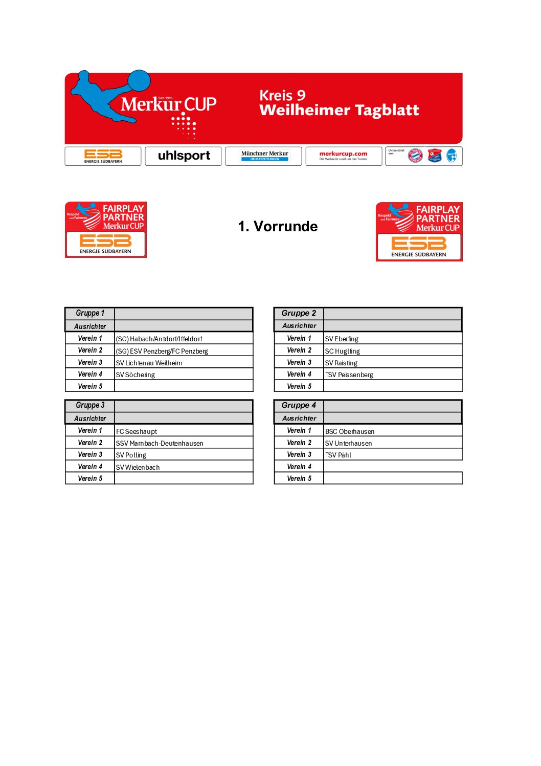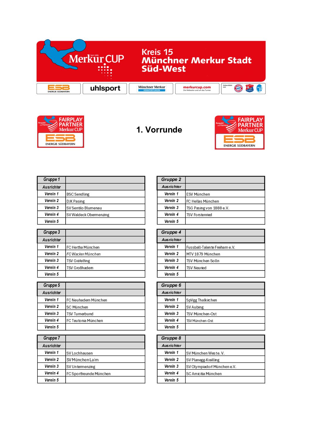 Gruppeneinteilungen 2026 Hier die Ergebnisse der Gruppenauslosung. Die Turnierpläne werden veröffentlicht, sobald sie feststehen. Kreis 01 – FS Kreis 02 – DAH Kreis 03 – ED Kreis 04 – EBE Kreis 05 – FFB Kreis 06 – SOG Kreis 07 – STA Kreis 08 – GAP Kreis 09 – WM Kreis 10 – TÖL Kreis 11 – WOR Kreis 12 – MB Kreis 13 – MM N Kreis 14 – MM S Kreis 15 – MM SW Kreis 16 – MM NO Kreis 17 – MÄ