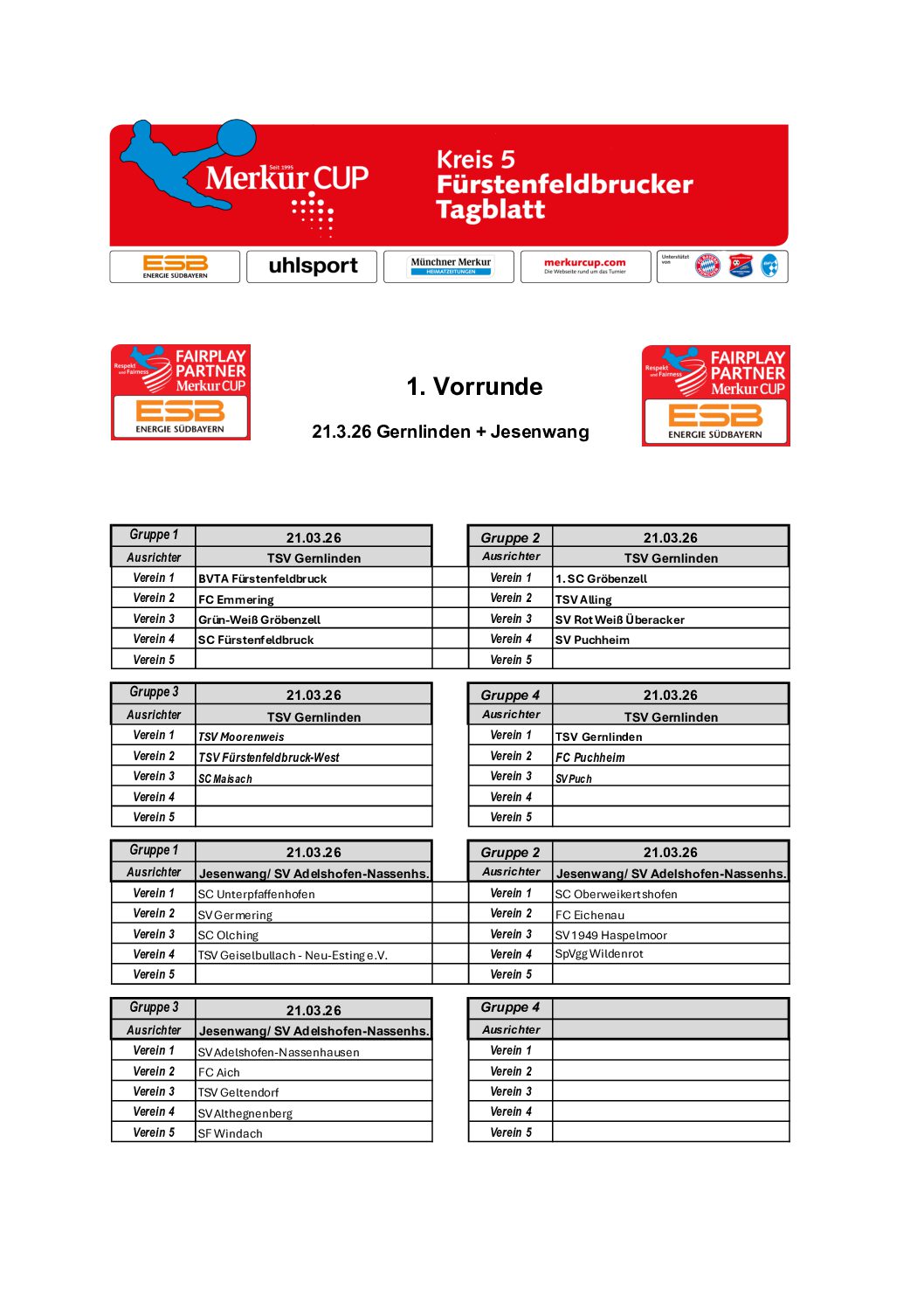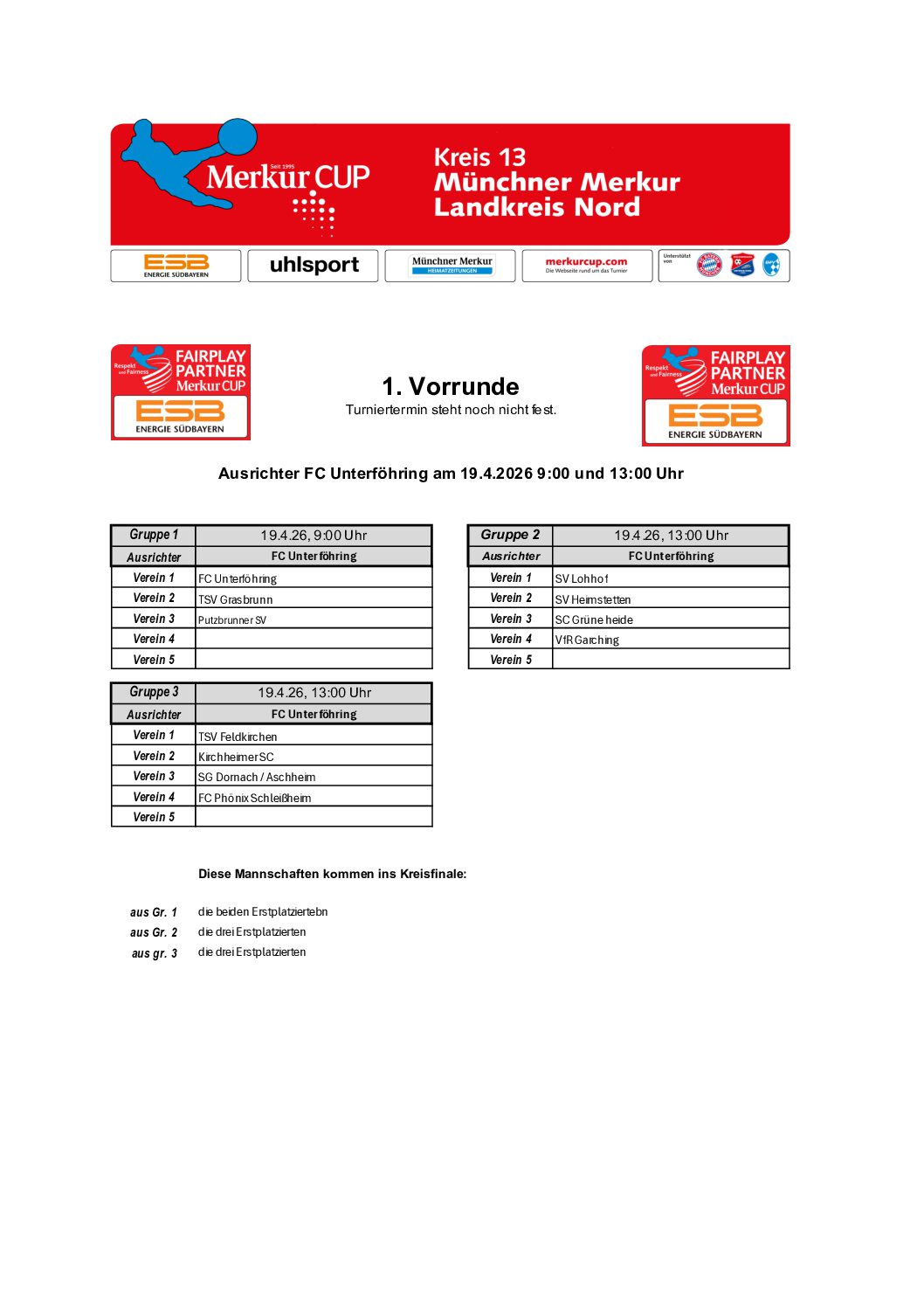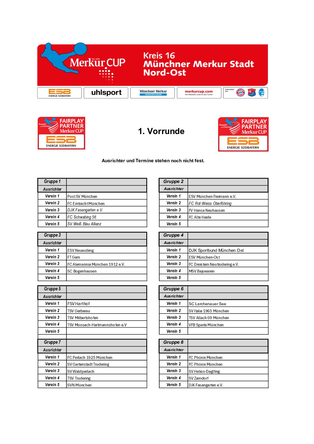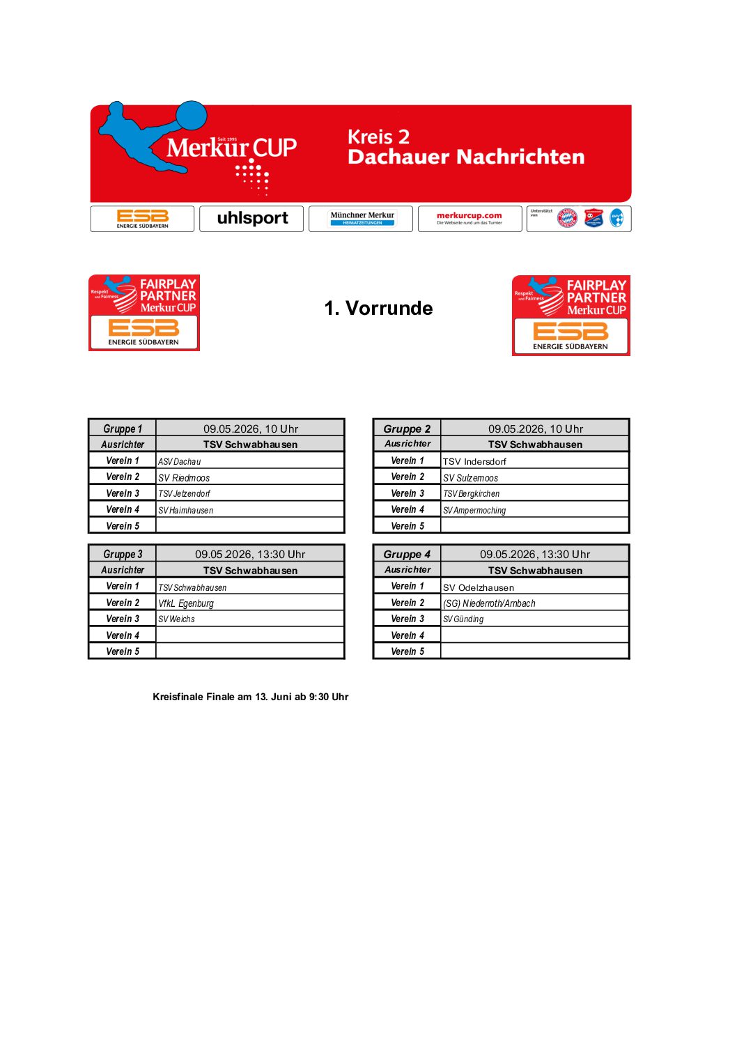 Gruppeneinteilungen 2026 Hier die Ergebnisse der Gruppenauslosung. Die Turnierpläne werden veröffentlicht, sobald sie feststehen. Kreis 01 – FS Kreis 02 – DAH Kreis 03 – ED Kreis 04 – EBE Kreis 05 – FFB Kreis 06 – SOG Kreis 07 – STA Kreis 08 – GAP Kreis 09 – WM Kreis 10 – TÖL Kreis 11 – WOR Kreis 12 – MB Kreis 13 – MM N Kreis 14 – MM S Kreis 15 – MM SW Kreis 16 – MM NO Kreis 17 – MÄ