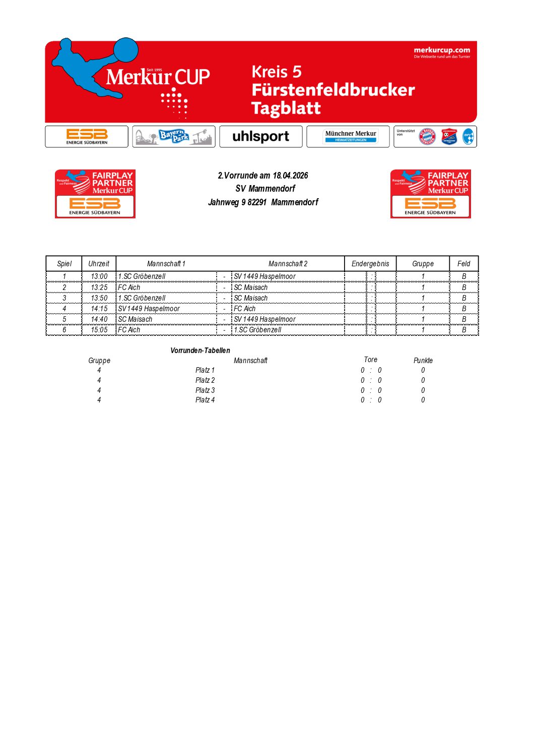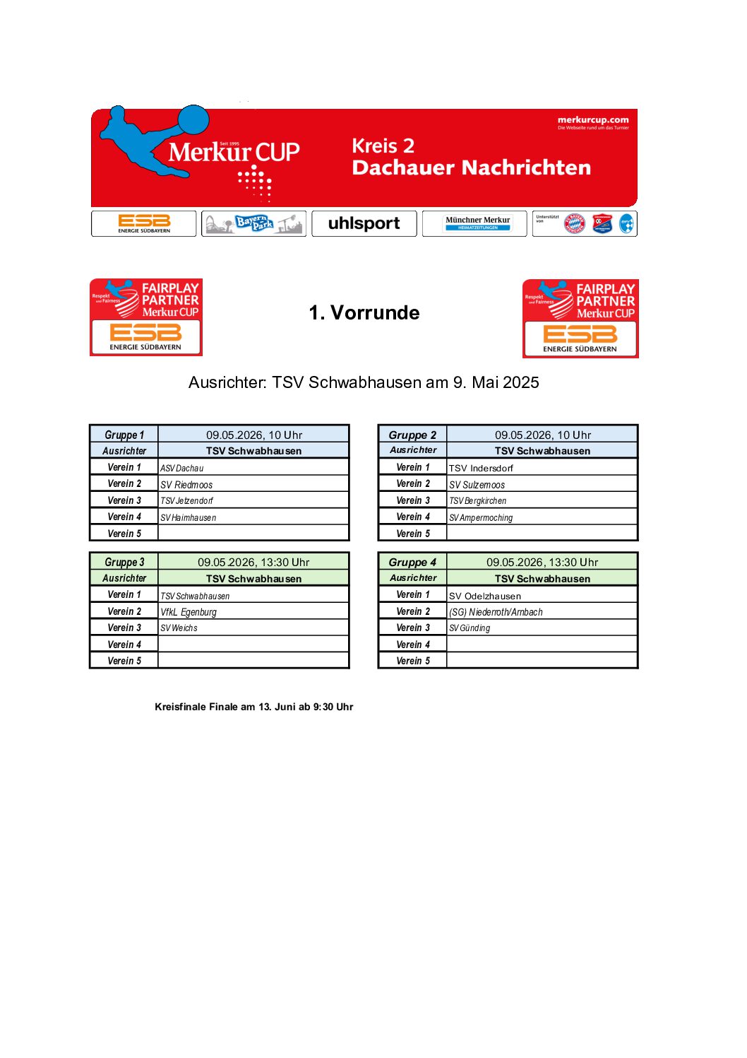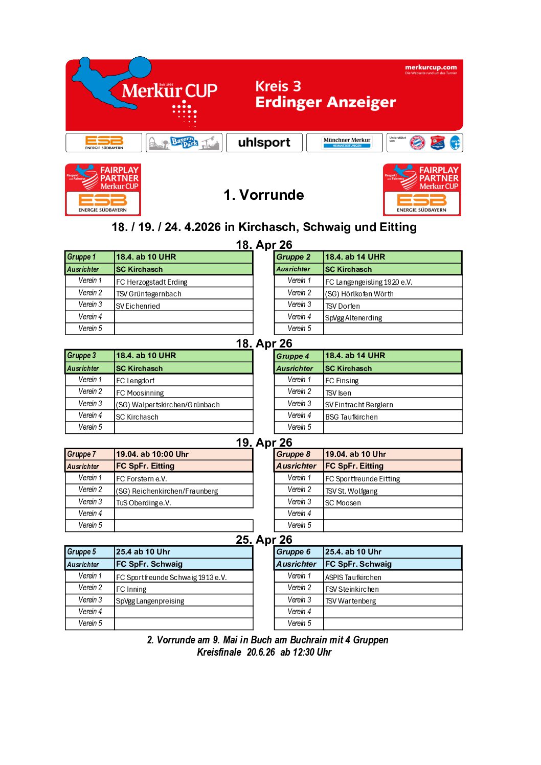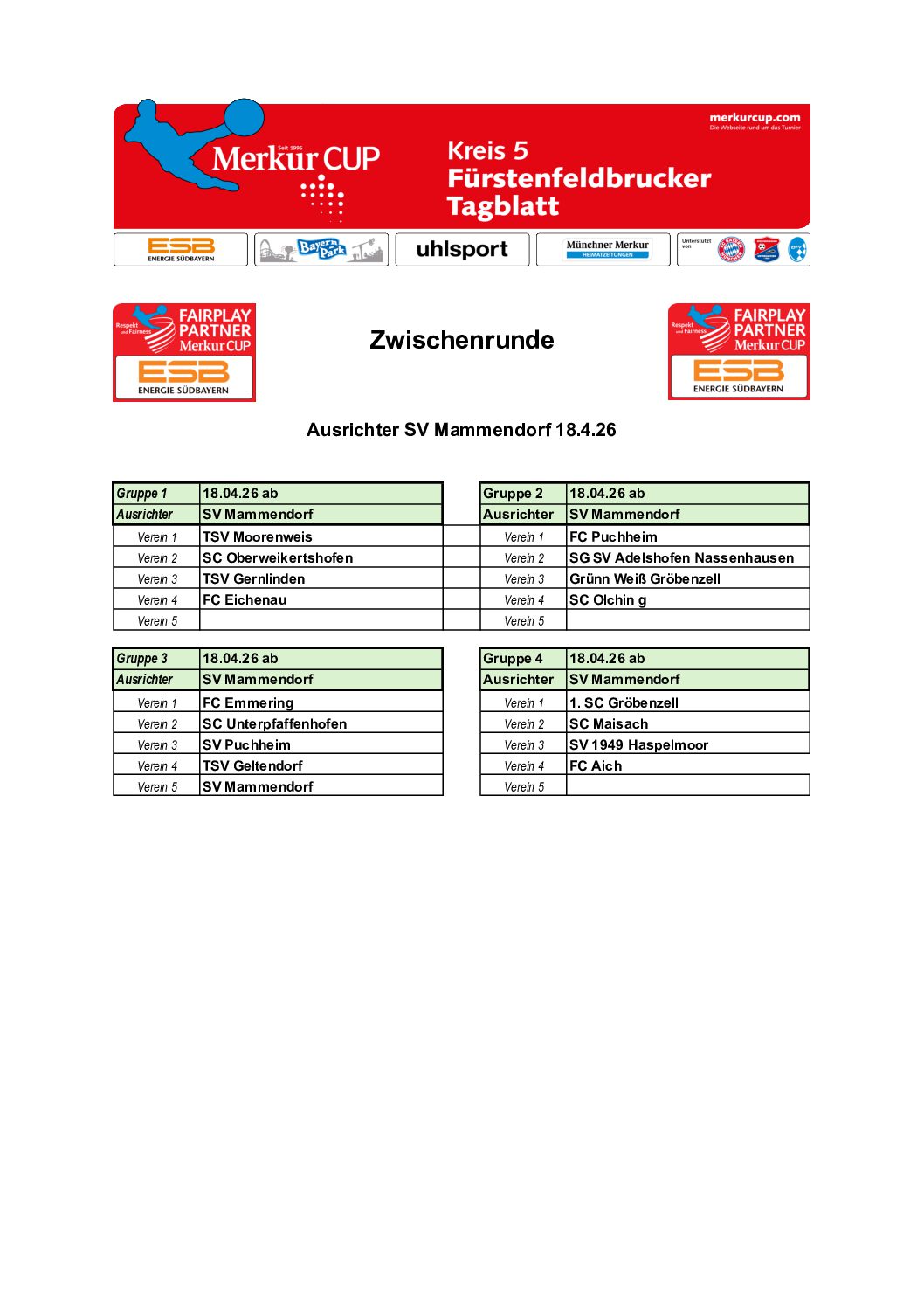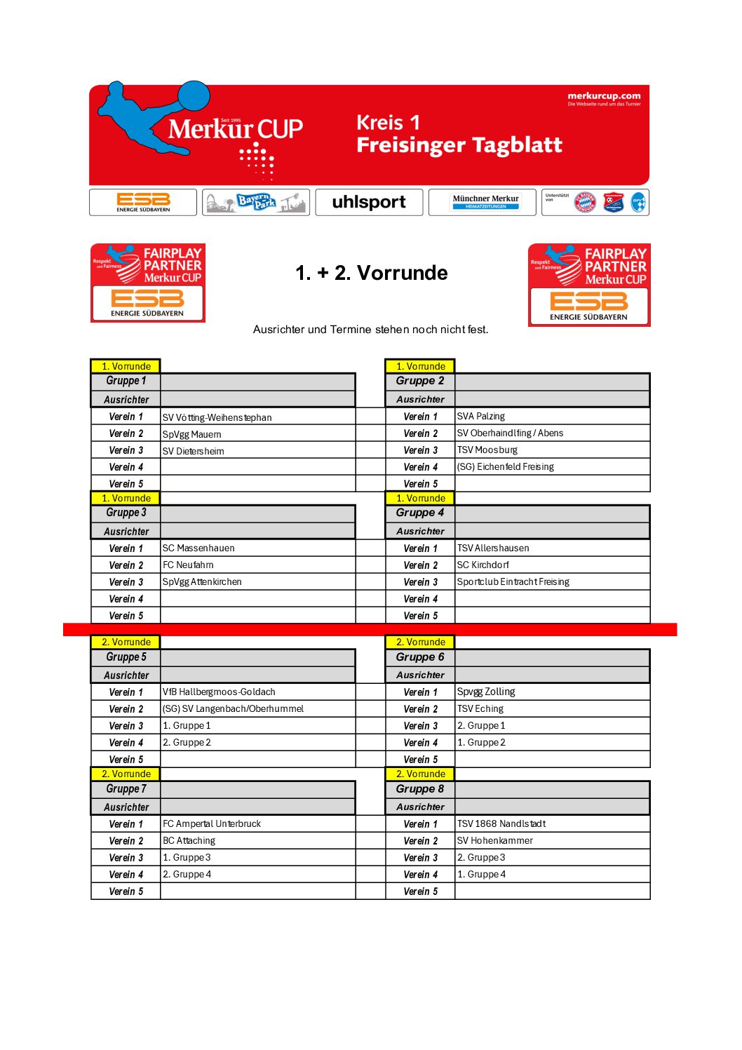 Gruppeneinteilungen 2026 Hier die Ergebnisse der Gruppenauslosung. Die Turnierpläne werden veröffentlicht, sobald sie feststehen. Kreis 01 – FS Kreis 02 – DAH Kreis 03 – ED Kreis 04 – EBE Kreis 05 – FFB Kreis 05 – Zwischenrunde 4 Kreis 05 – Zwischenrunde 1 Kreis 05 – Zwischenrunde 5 Kreis 05 – Zwischenrunde 2 Kreis 05 – Zwischenrunde 3 Kreis 06 – SOG Kreis 07 – STA Kreis 08 – GAP Kreis 09 – WM Kreis 10 – TÖL Kreis 11 – WOR Kreis 12 – MB Kreis 13 – MM N Kreis 14 – MM S Kreis 15 – MM SW Kreis 16 – MM NO Kreis 17 – MÄ