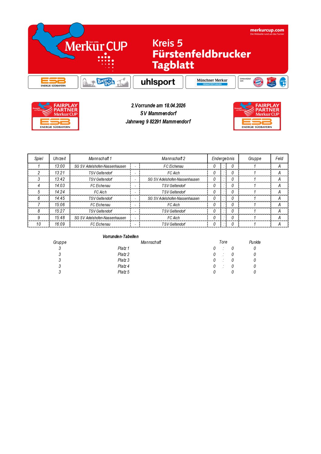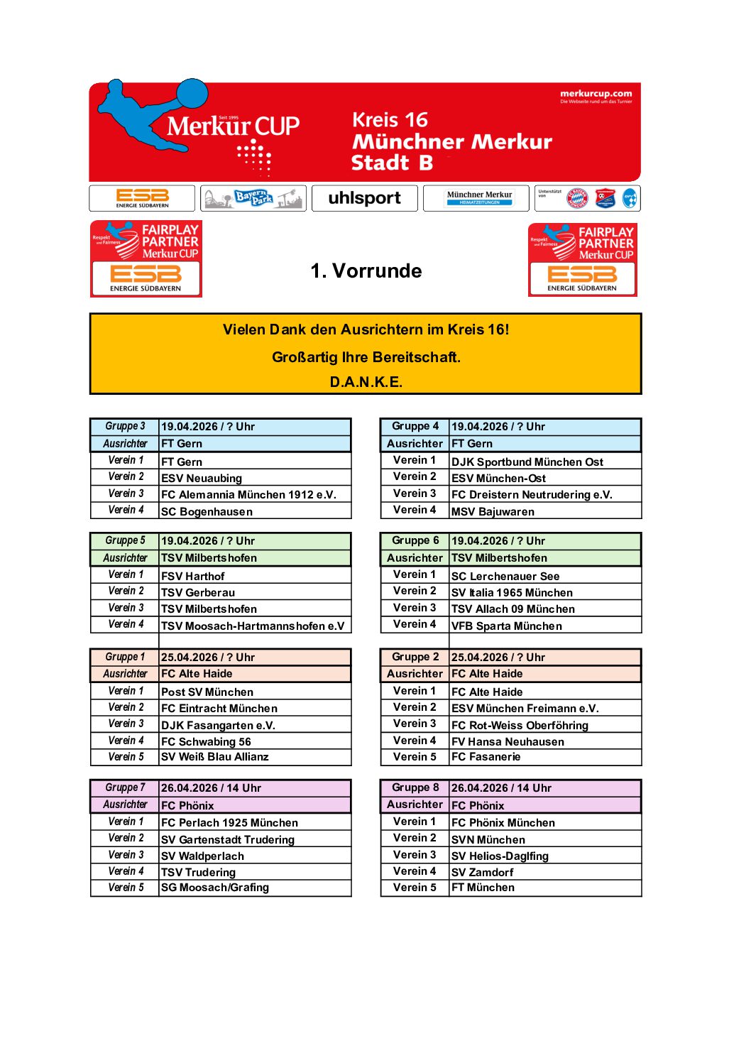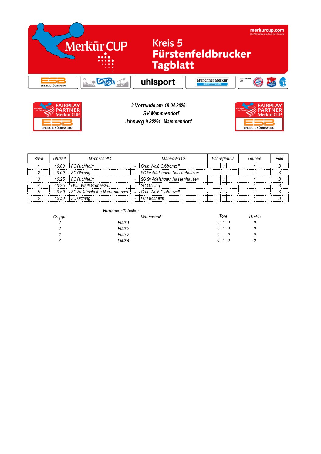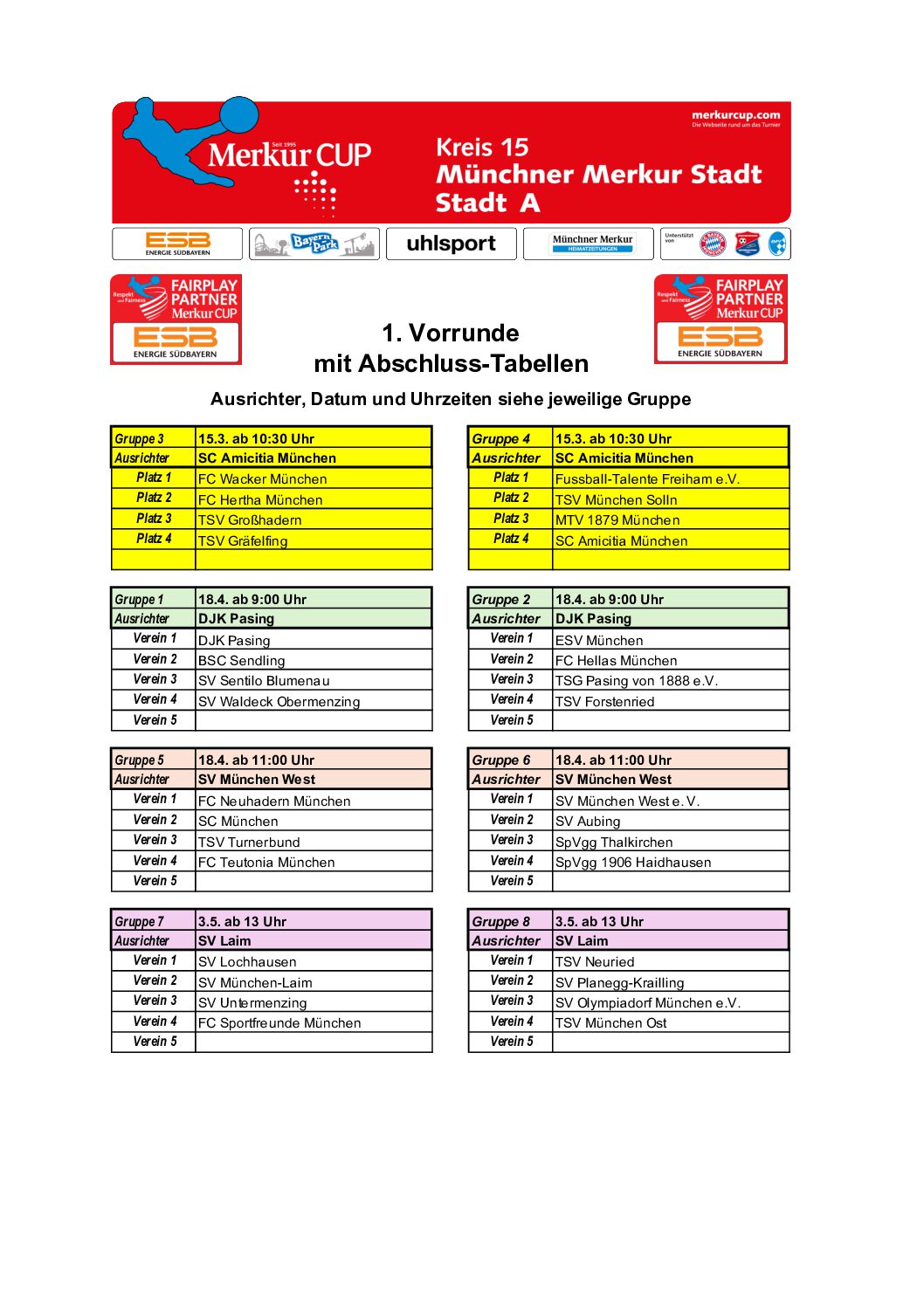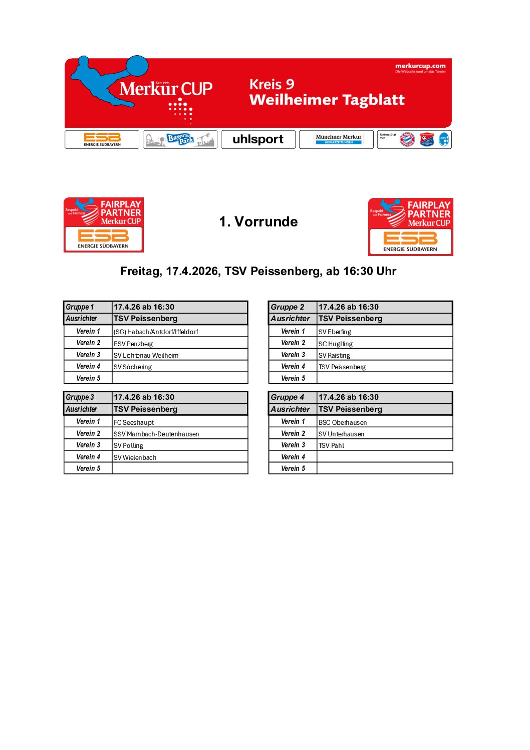 Gruppeneinteilungen 2026 Hier die Ergebnisse der Gruppenauslosung. Die Turnierpläne werden veröffentlicht, sobald sie feststehen. Kreis 01 – FS Kreis 02 – DAH Kreis 03 – ED Kreis 04 – EBE Kreis 05 – FFB Kreis 05 – Zwischenrunde 4 Kreis 05 – Zwischenrunde 1 Kreis 05 – Zwischenrunde 5 Kreis 05 – Zwischenrunde 2 Kreis 05 – Zwischenrunde 3 Kreis 06 – SOG Kreis 07 – STA Kreis 08 – GAP Kreis 09 – WM Kreis 10 – TÖL Kreis 11 – WOR Kreis 12 – MB Kreis 13 – MM N Kreis 14 – MM S Kreis 15 – MM SW Kreis 16 – MM NO Kreis 17 – MÄ